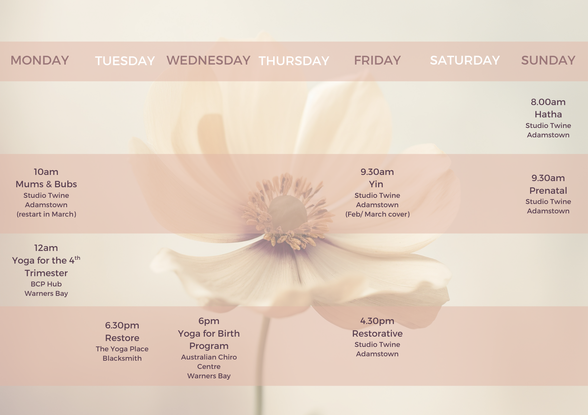 "Yoga for the 4th Trimester' and 'Yoga for Birth' are programs that will run regularly through the year. More details under the Postpartum / Pregnancy tabs